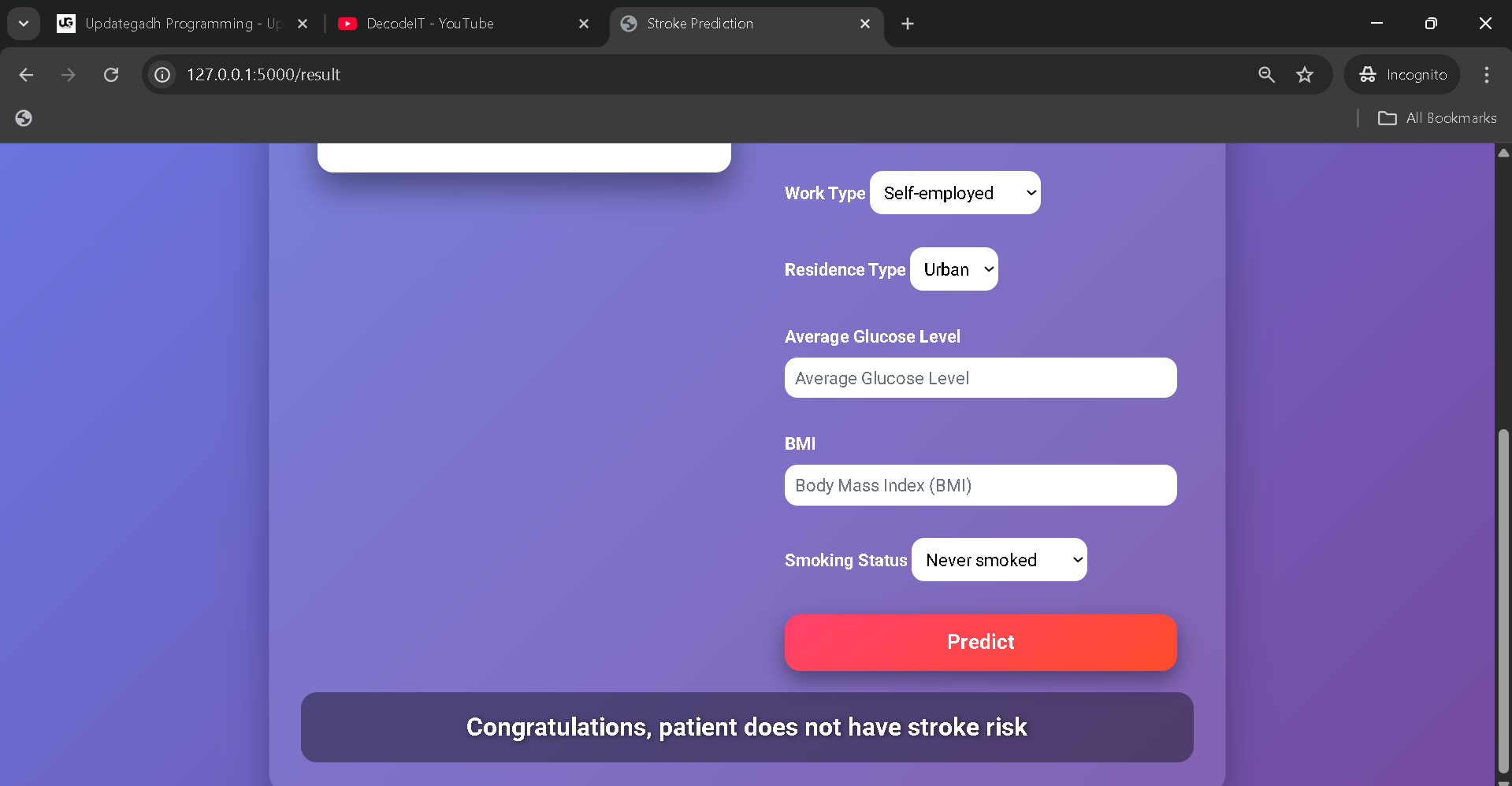 A simple project on Brain Stroke Prediction was developed to showcase the practical use of machine learning in the healthcare domain. This project predicts the likelihood of a patient experiencing a stroke based on various health-related attributes such as age, gender, hypertension, heart disease, marital status, work type, residence type, average glucose level, BMI, and smoking status. By analyzing these features, the system can provide an early indication of stroke risk, which can be useful for preventive healthcare measures.