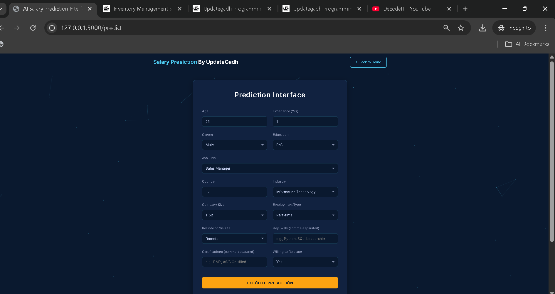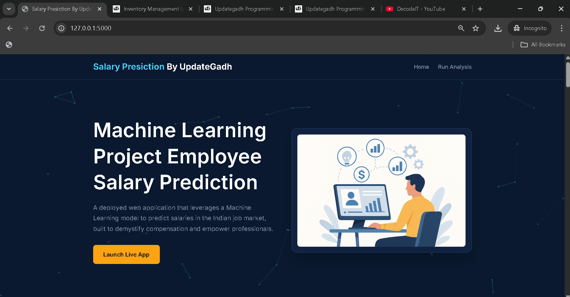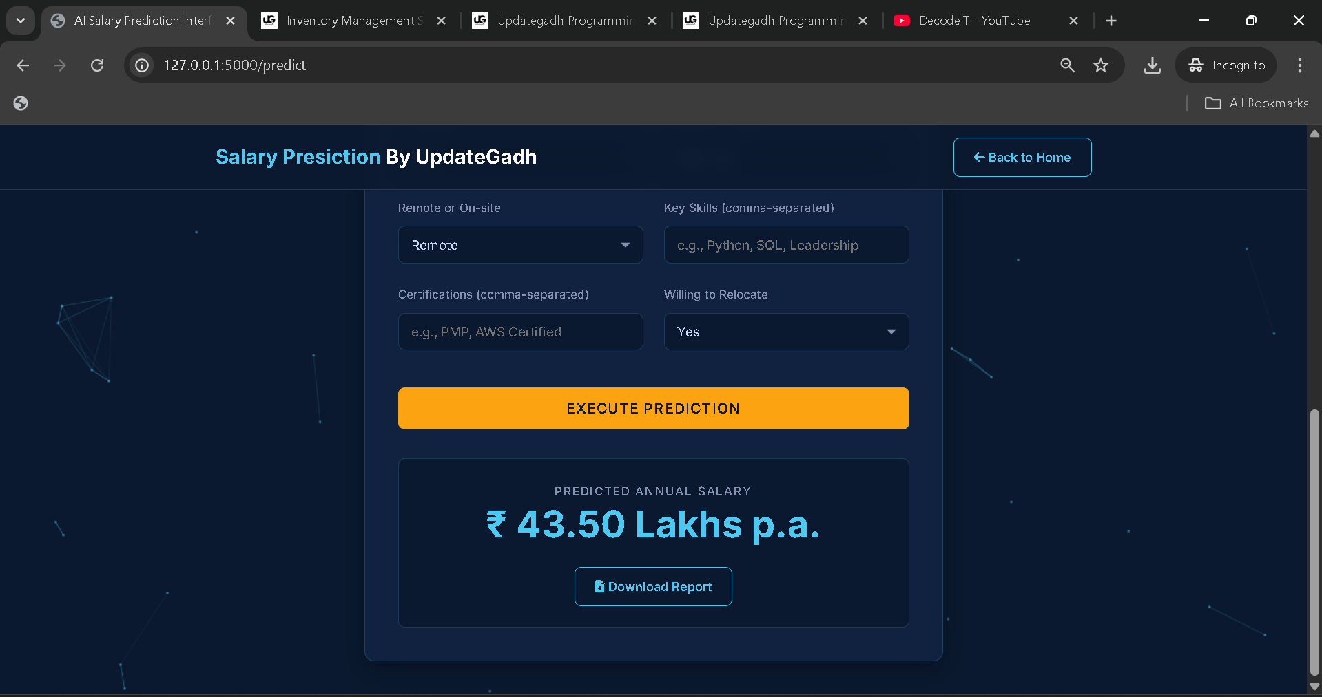 The application leverages supervised ML models to generate predictions and comes with an interactive web interface where users can input their details and receive salary estimates in real time. It also integrates preprocessing pipelines, data cleaning methods, and visualization tools to ensure the results are accurate and meaningful.