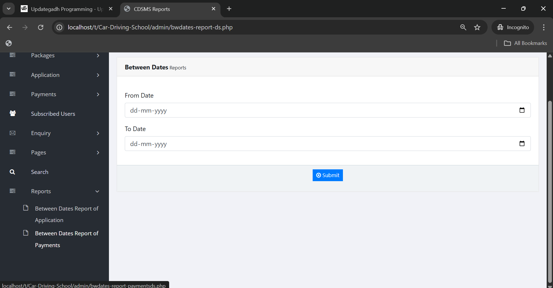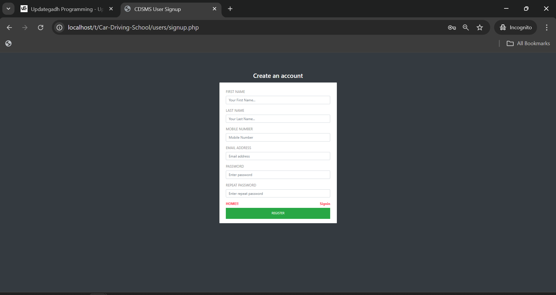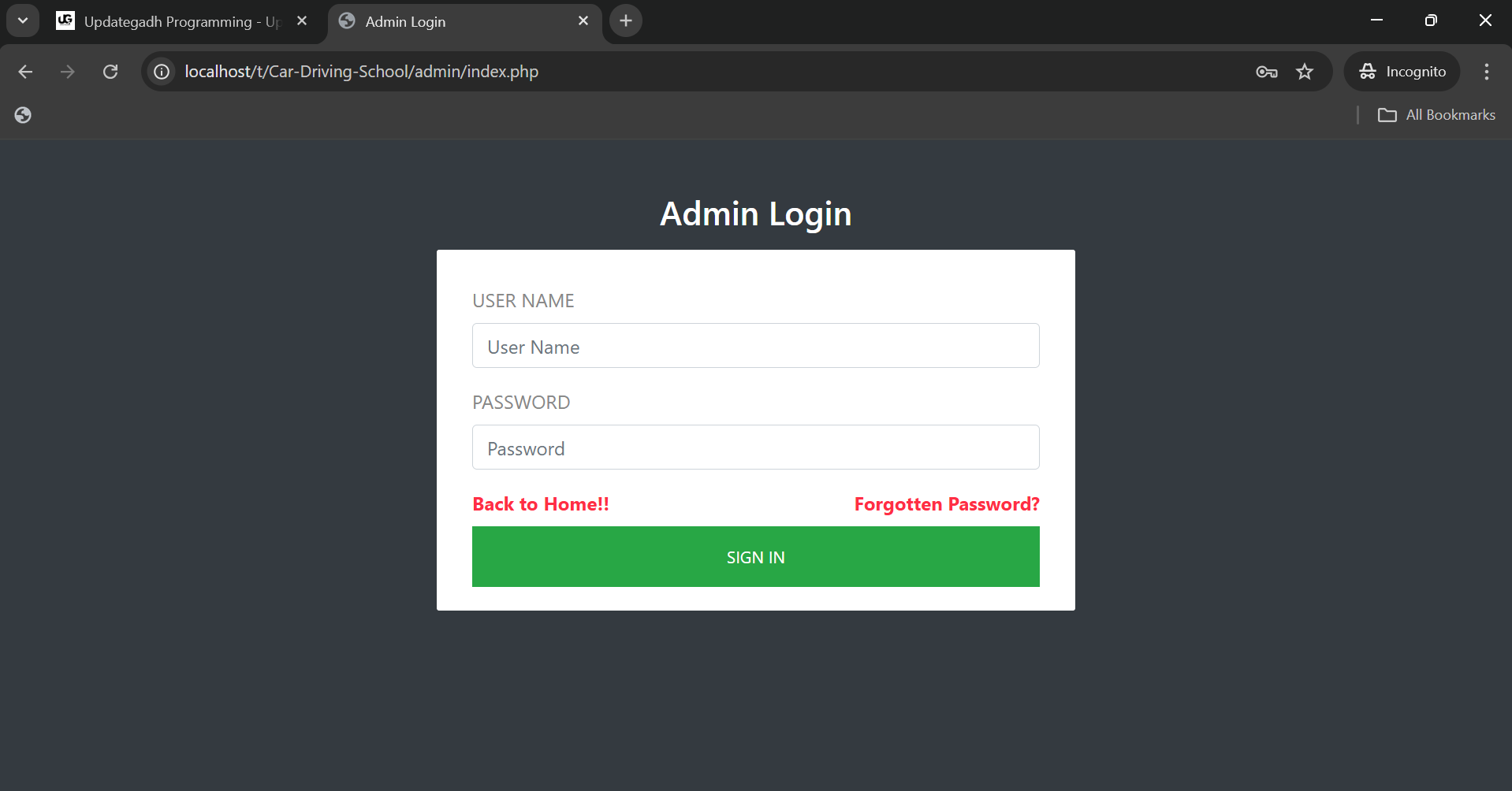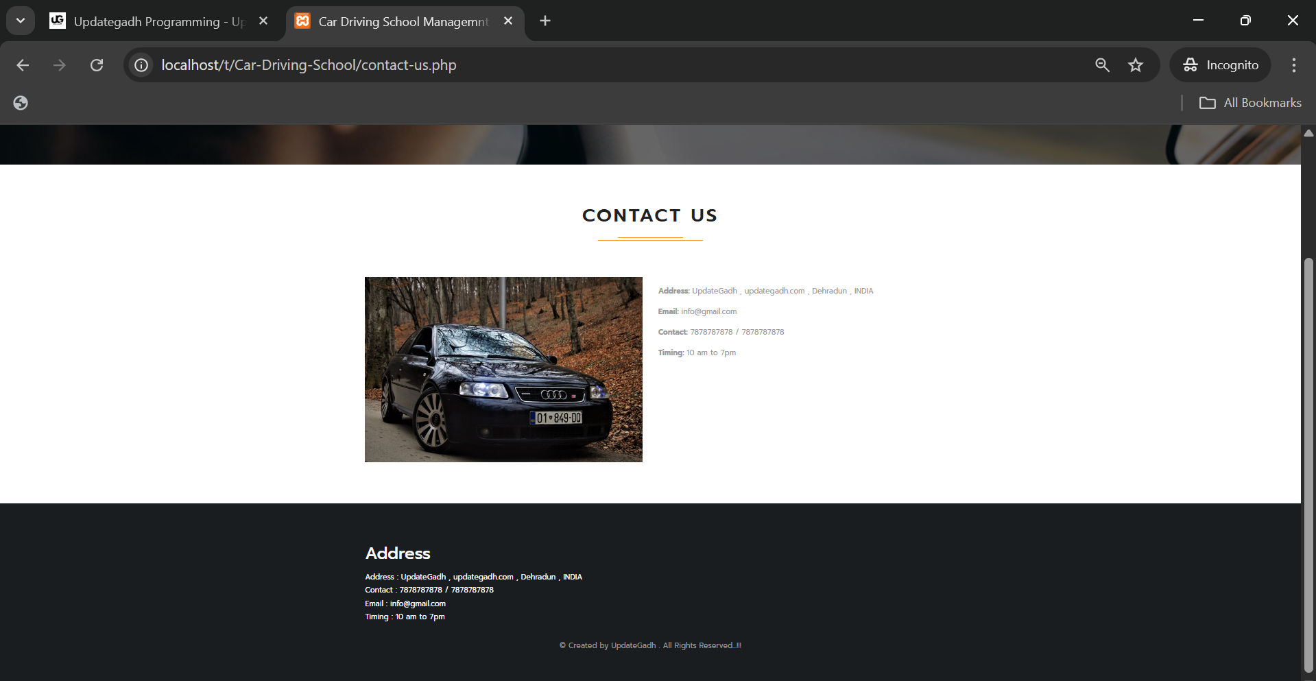 Open your browser and run the project using:http://localhost/Car-Driving-School-Management/cdsms/