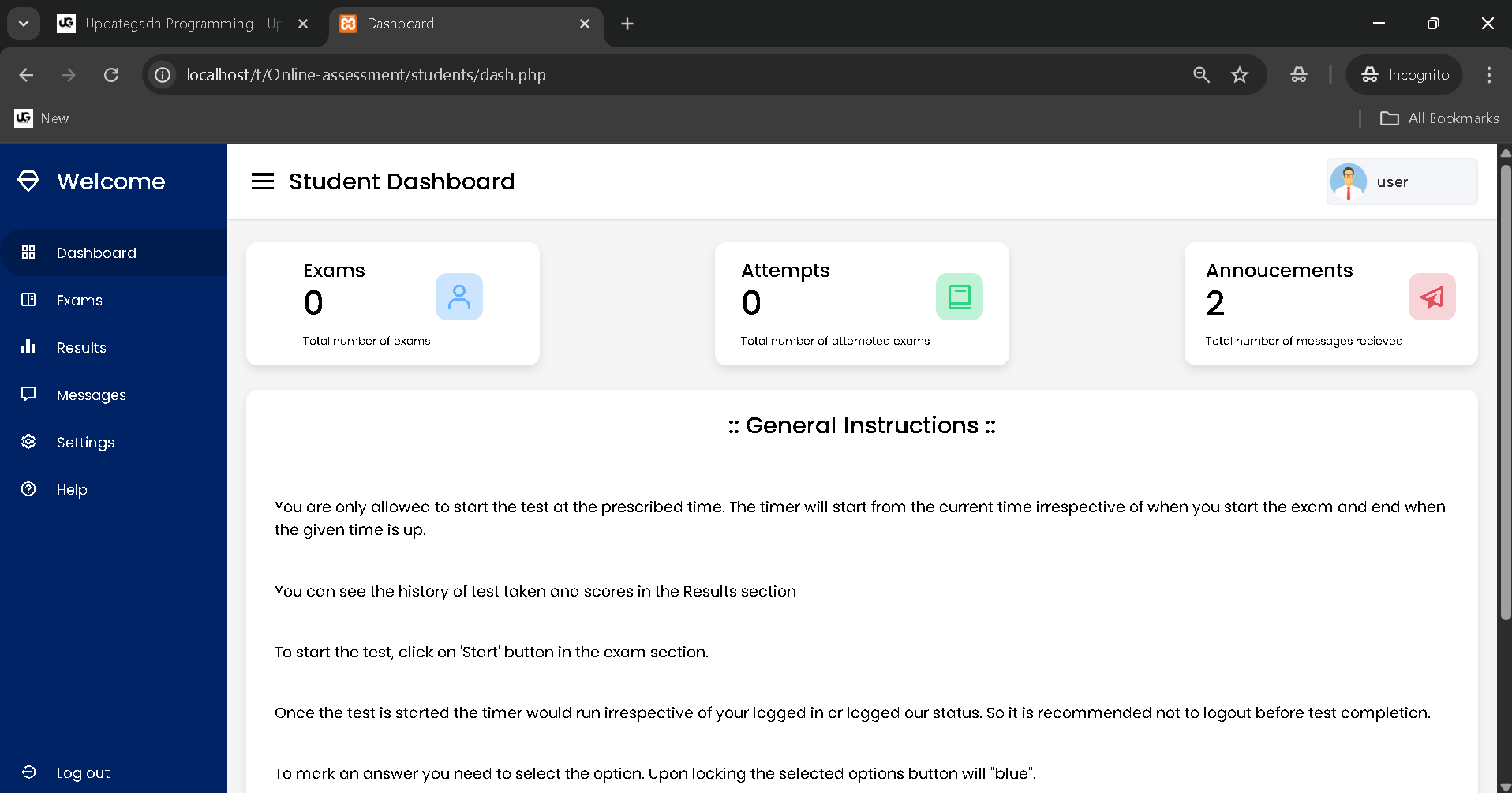 Students can access a personalized dashboard that displays key information such as the number of exams available, attempted exams, and teacher announcements. - General Instructions
