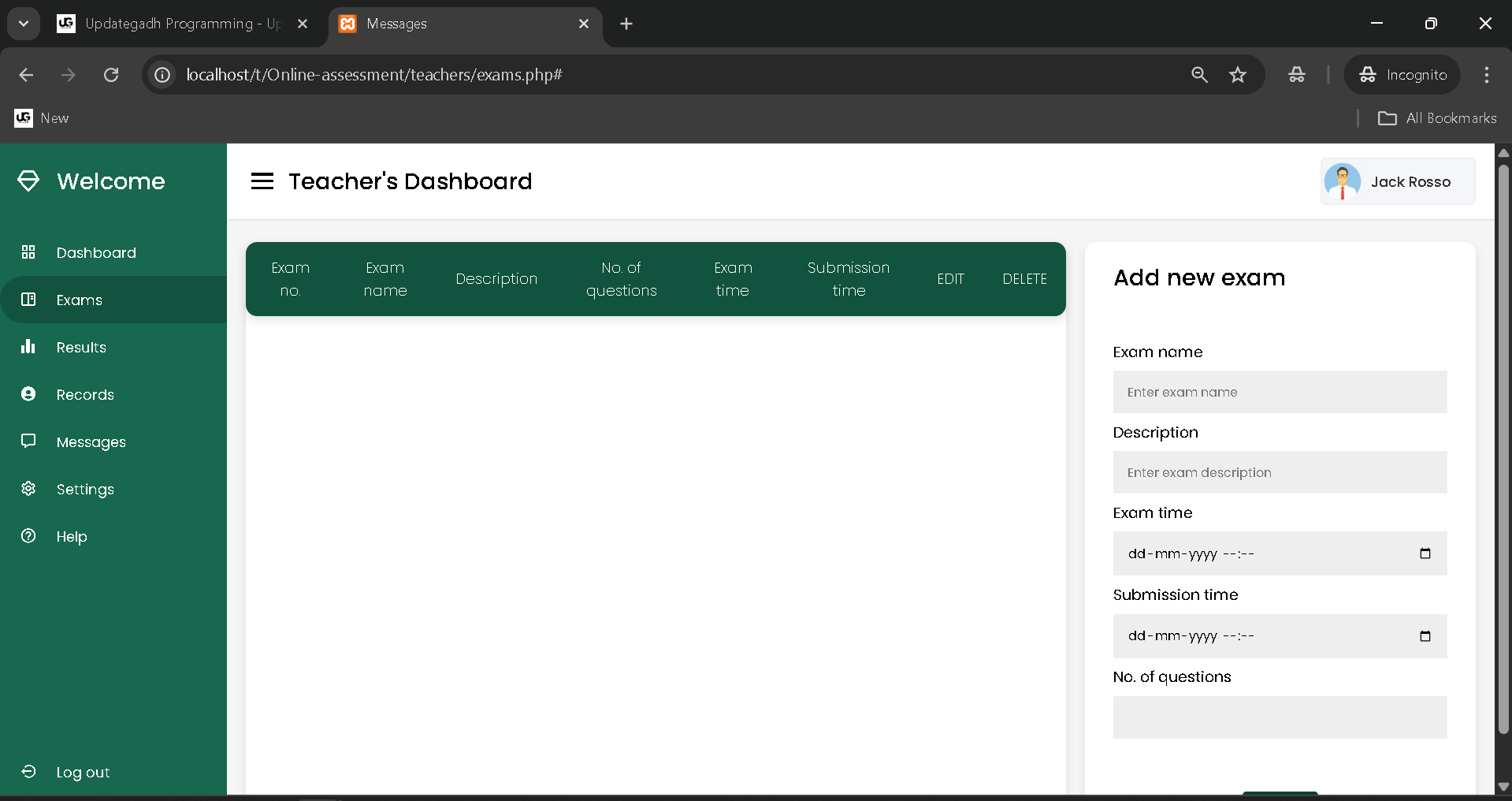 - Navigate to the Exams section to manage exams and add questions.