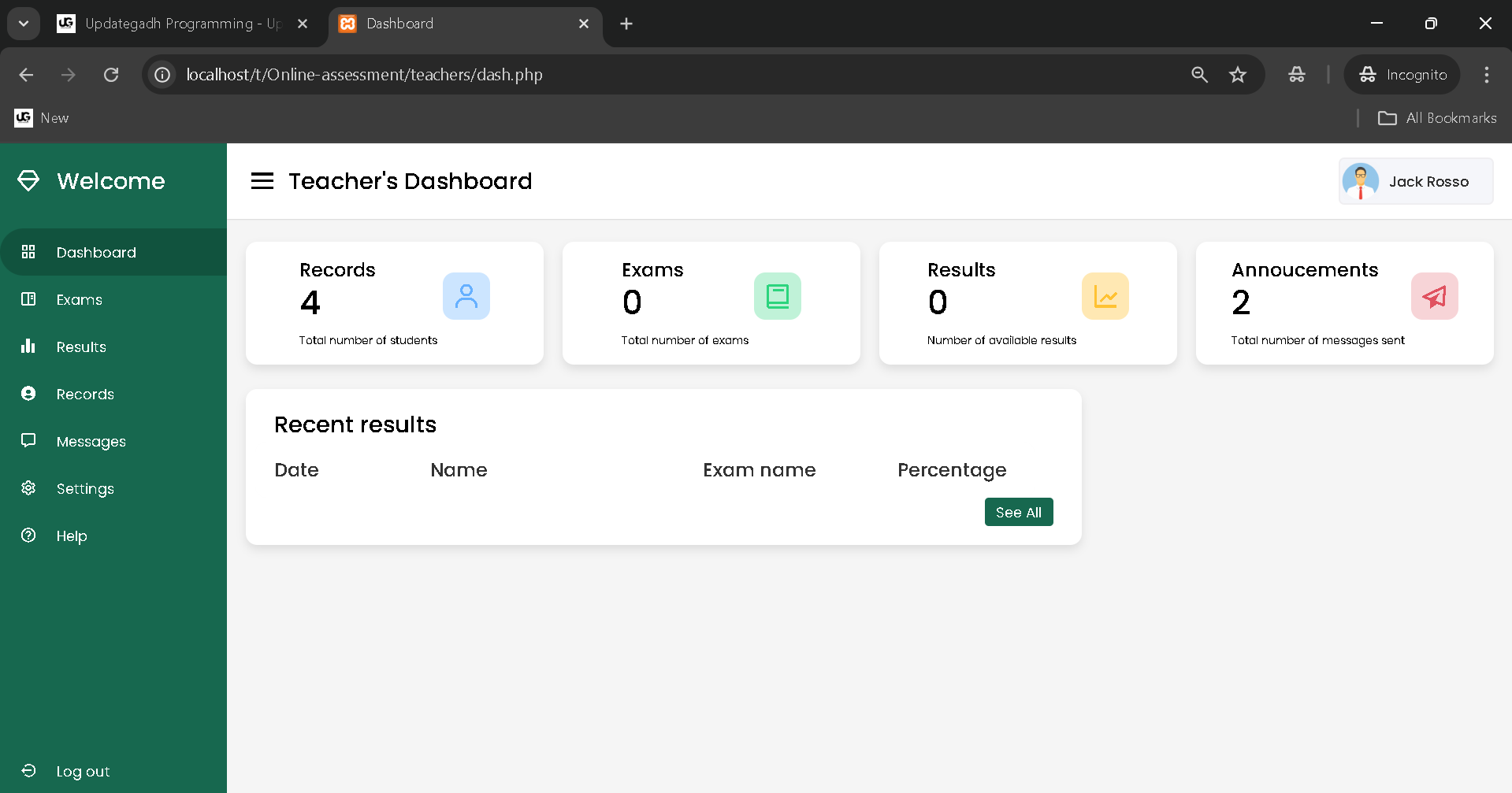 Teachers can view all key statistics in one place, including the total number of exams conducted, results published, recent student performance, and important announcements. - Profile Management