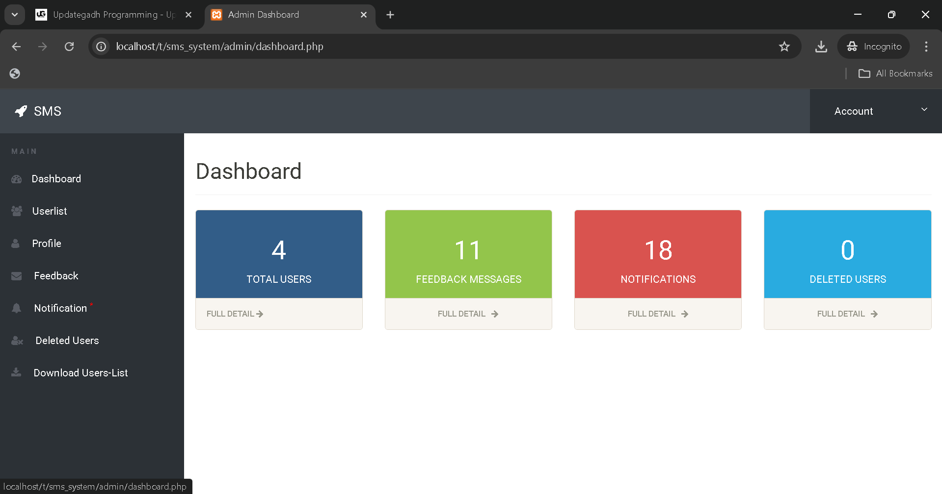 The admin dashboard provides a comprehensive overview of total users, deleted users, notifications, and feedback messages, giving administrators a clear picture of society management.