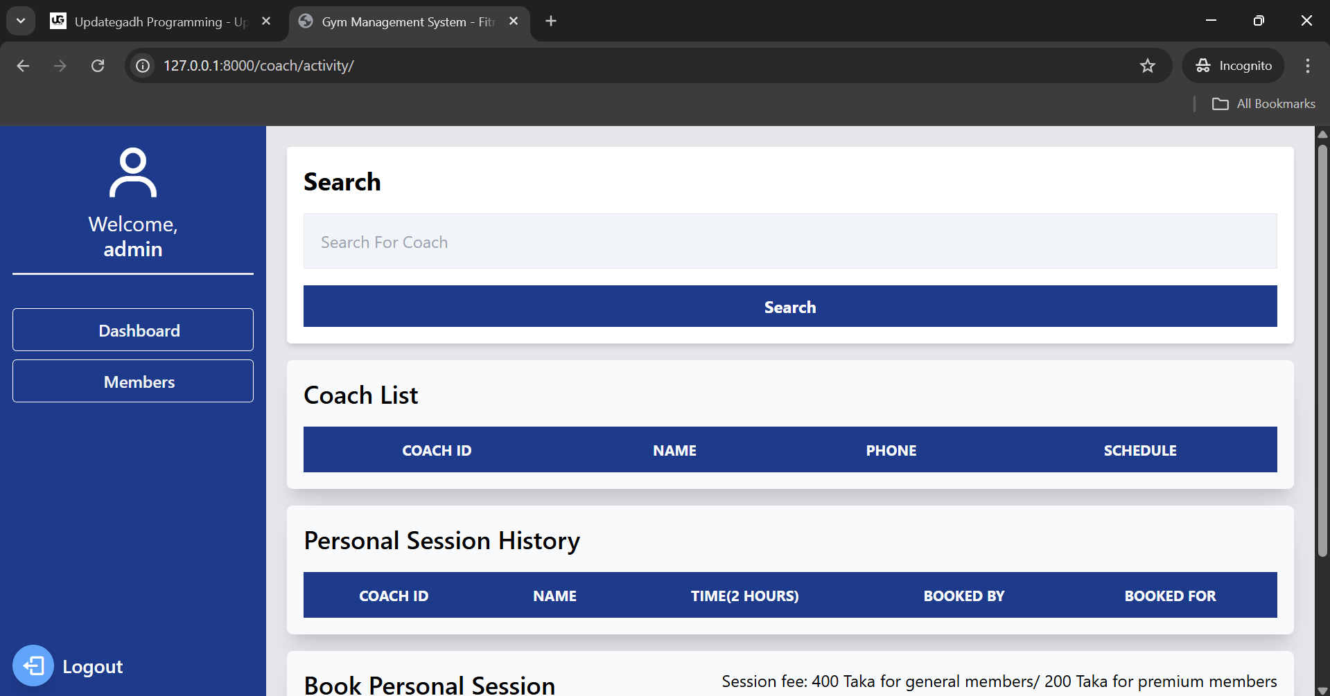 - Private Coach Session – Members can have private coaching sessions scheduled by staff members.The system automatically applies pricing rules: Premium members pay a discounted rate while others follow standard charges.