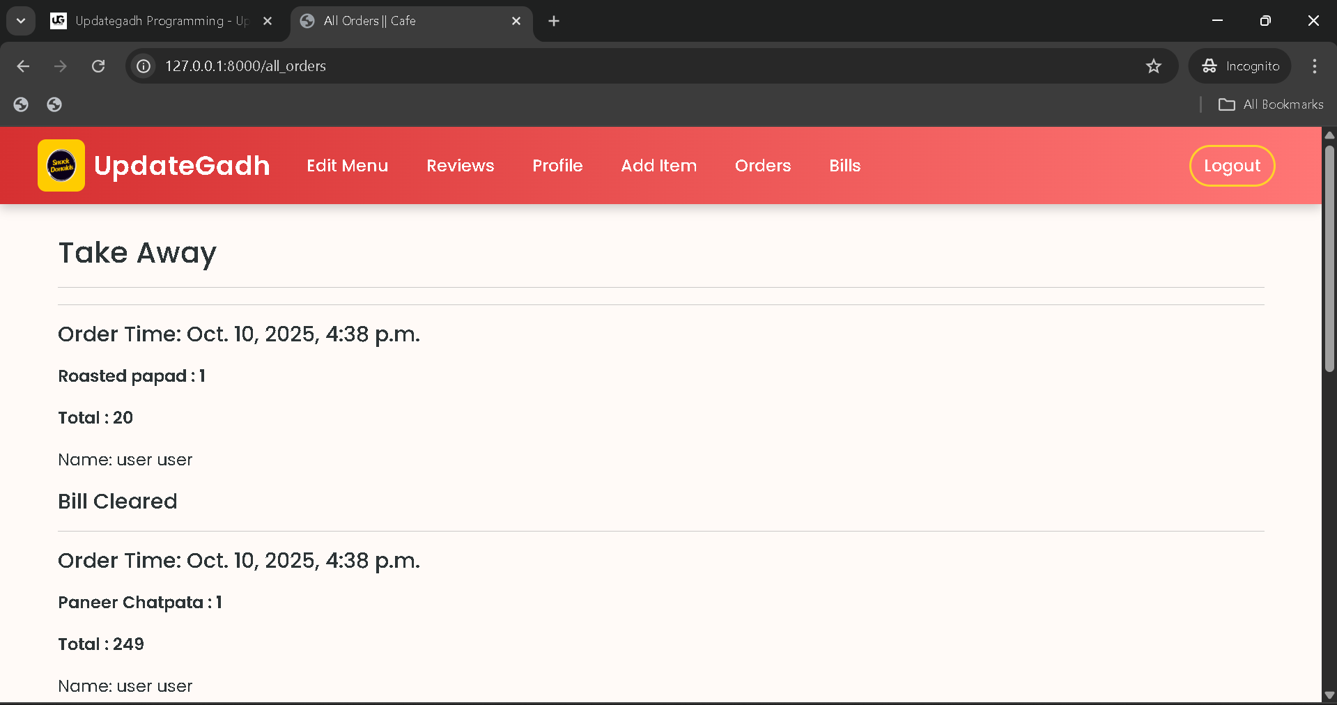 • Manage billing — view bills, track order totals, and mark them as cleared after payment.