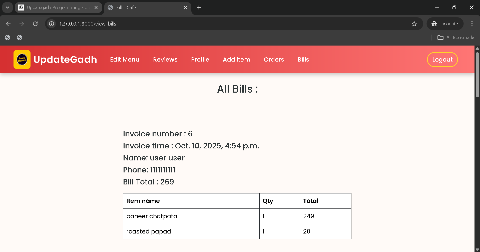 This project represents a real-world restaurant workflow where every process — from displaying the menu to generating bills — is automated and handled efficiently. It is perfect for small cafés, restaurants, or students who want to learn full-stack development using Django.