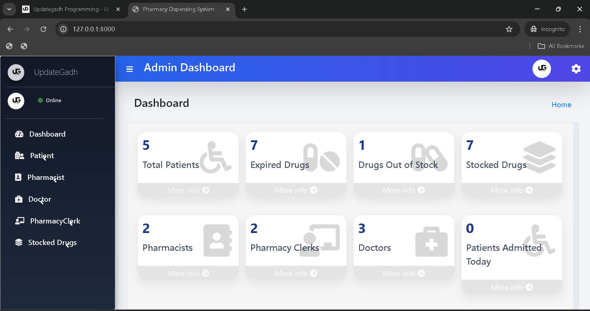 A simple project on Pharmacy Management System designed to automate the daily operations of a pharmacy. This web-based system is developed using Python Django Framework and offers a complete solution for managing medicines, prescriptions, and patient details efficiently. The project includes different user roles such as Administrator, Pharmacist, Doctor, Receptionist (Pharmacy Clerk), and Patient, each with specific access and functionalities.