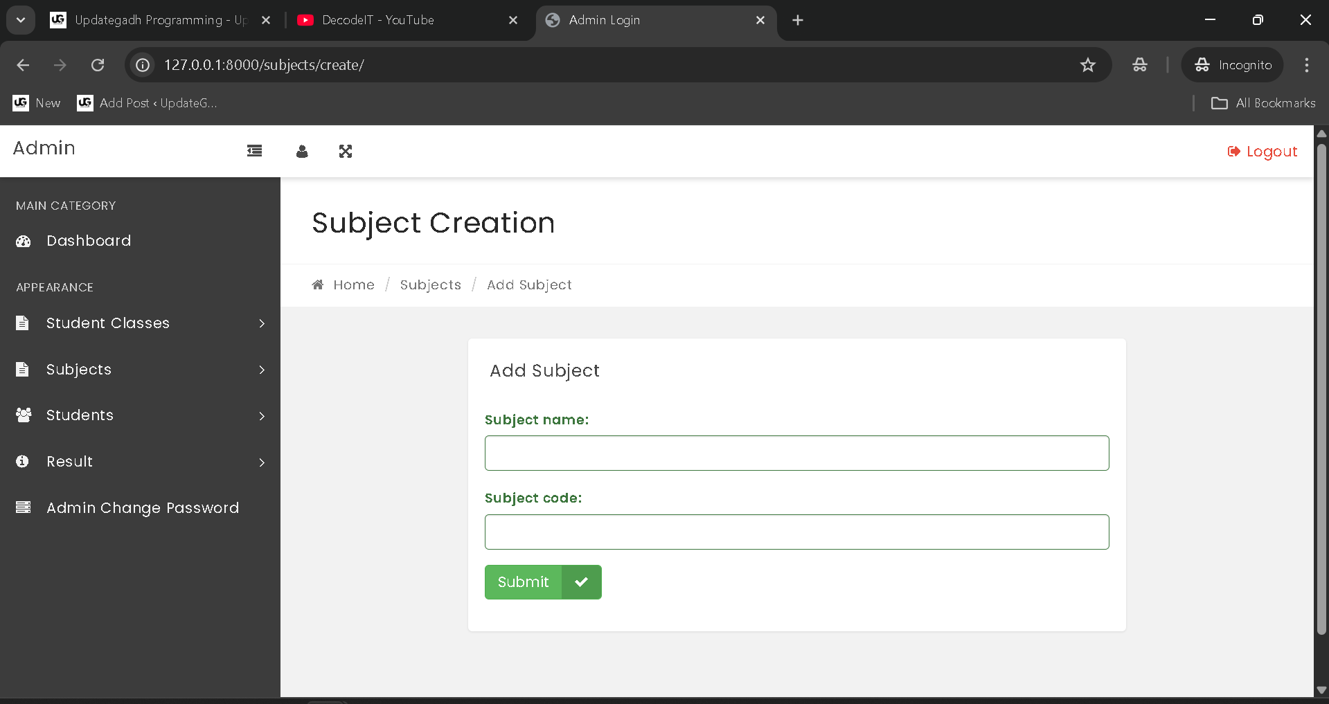 The system allows the admin to add and manage subjects that are essential for result calculation. Subjects can be updated when changes occur in the curriculum, ensuring that the result generation process always reflects the correct academic structure.