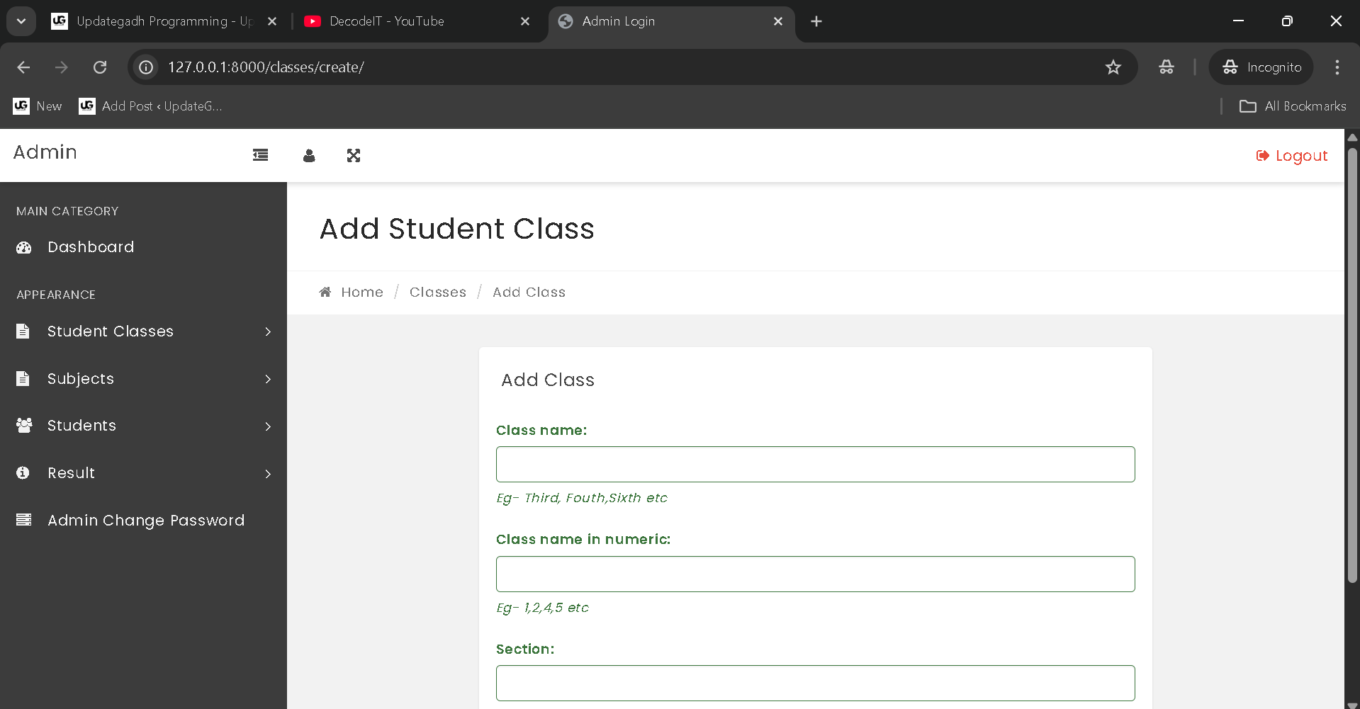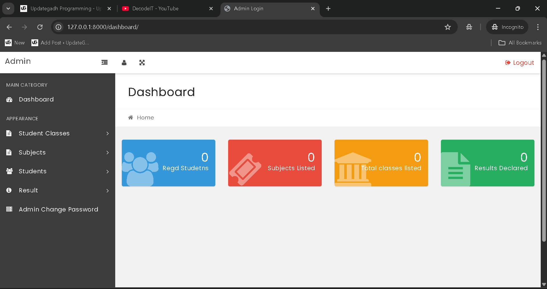 As a student, I found this project extremely helpful because it shows how Django can be applied to solve practical challenges in education. The Student Result Management System demonstrates key aspects of web development, such as working with databases, implementing authentication, and managing different user roles.
