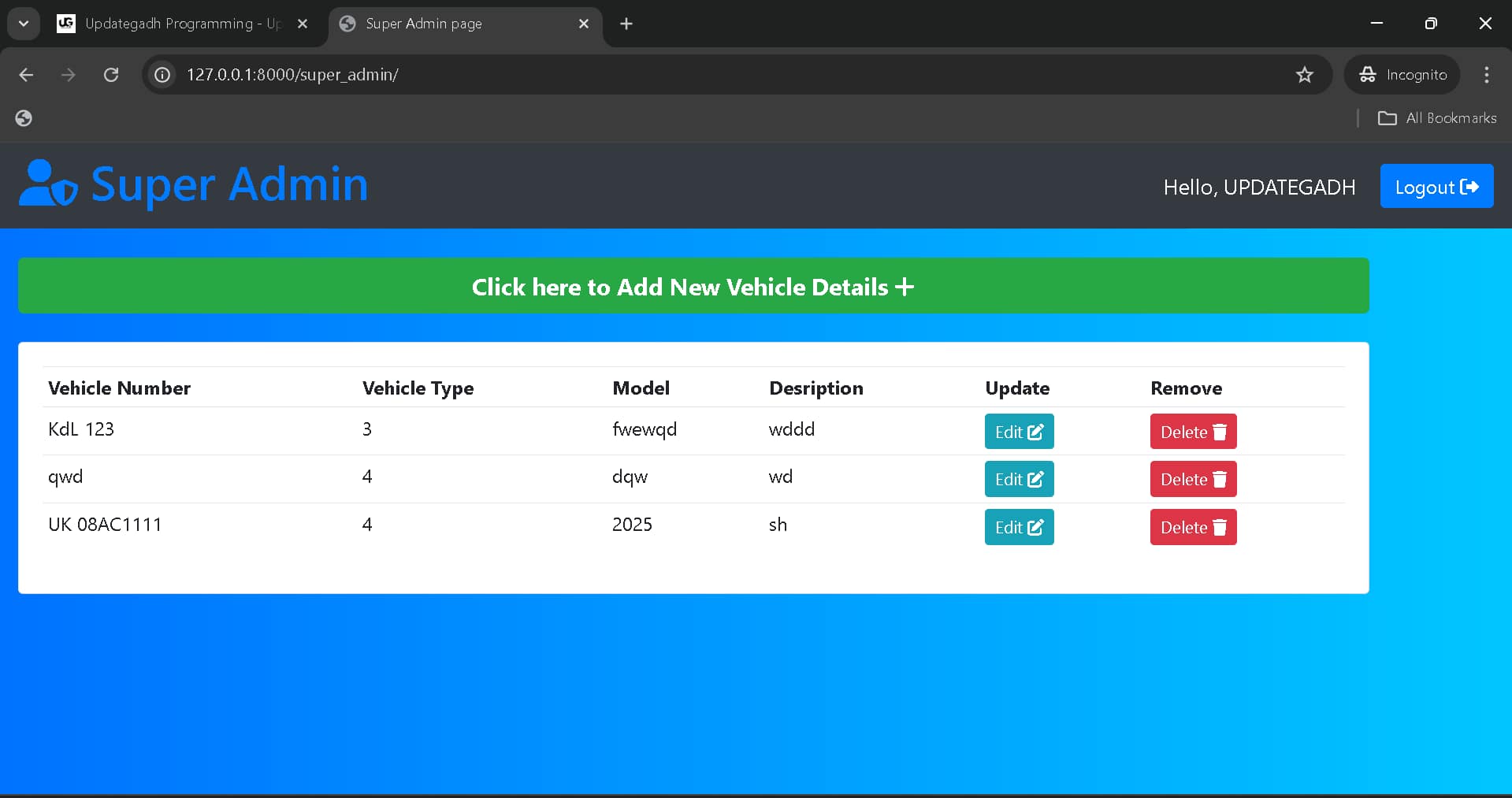 A simple project based on Vehicle Management System which uses Python Django Framework for web application development. Following Django project contains all the essential features that can be useful for IT and Computer Science students in their academic projects. It allows users and admins to manage vehicles, user accounts, and records with proper authentication and role-based access. This system, as well as the Django application’s concept, is clear and reflects real-life scenarios of vehicle record handling, making it easy to understand and implement.