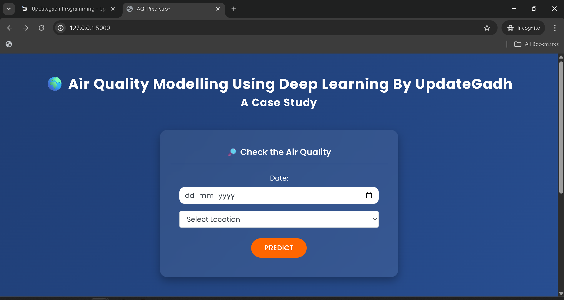 A simple project based Air Quality Prediction Using Deep Learning is developed by UPDATEGADH to forecast Air Quality Index (AQI) values more accurately. With increasing industrialization, urban growth, and population density, maintaining clean air has become a major challenge. Poor air quality directly impacts human health, leading to respiratory problems, reduced life expectancy, and climate-related issues.