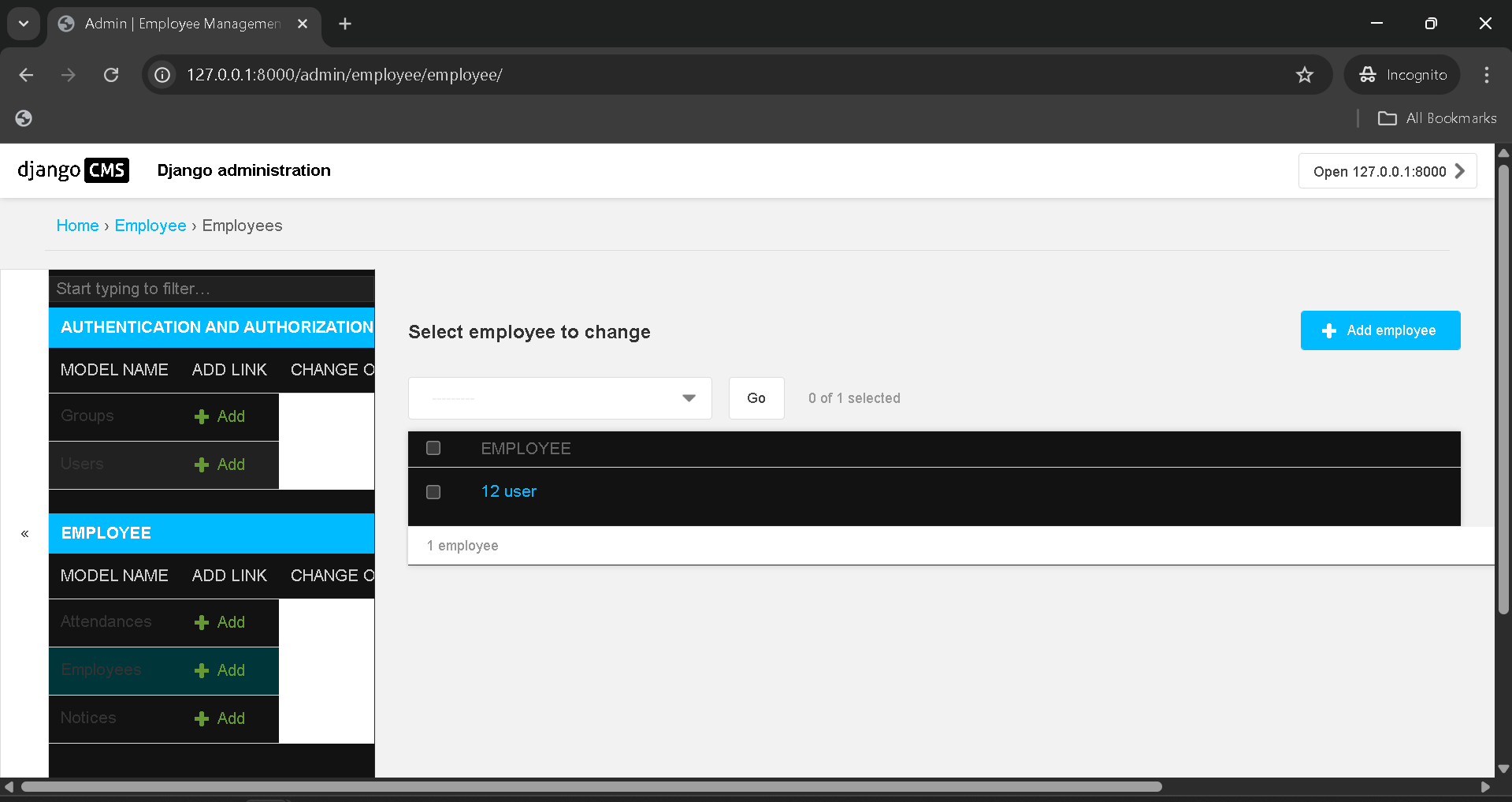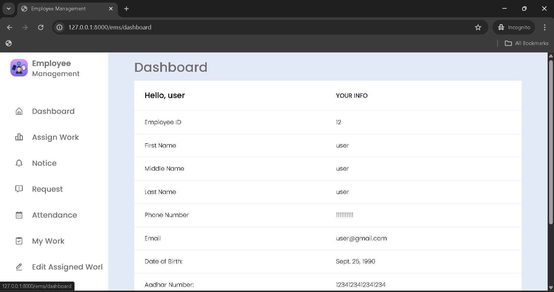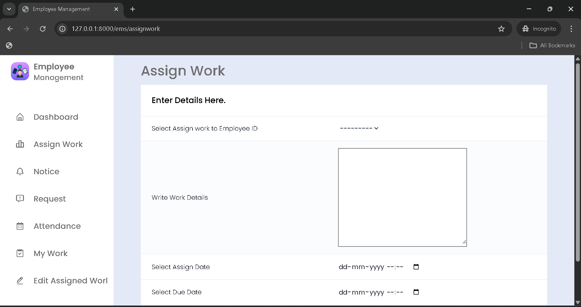 A simple project on Employee Management System has been developed using Python (Django Framework) with SQLite as the database. This system is designed to help organizations manage their employees effectively by providing structured modules for employee data, attendance, notices, work assignments, and request handling.